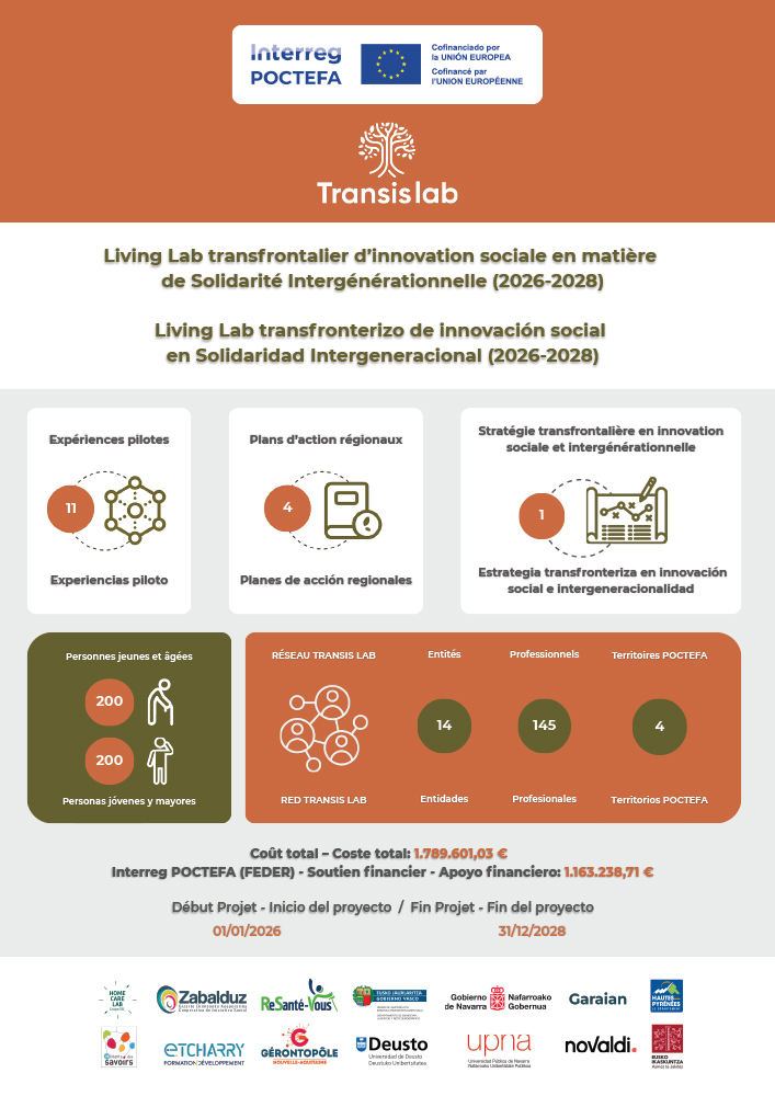 Projet POCTEFA (2024-2026), l’objectif de TRANSIS LAB est de créer un Living Lab transfrontalier en tant que laboratoire d’expérimentation à usage partagé pour promouvoir 6 expériences pilotes. Elles ont vocation à connecter différentes ressources d’accompagnement socio-sanitaires pour améliorer la qualité de vie de 400 personnes âgées fragiles en milieu rural dans les régions d’Euskadi, Navarre, Nouvelle-Aquitaine et Occitanie.